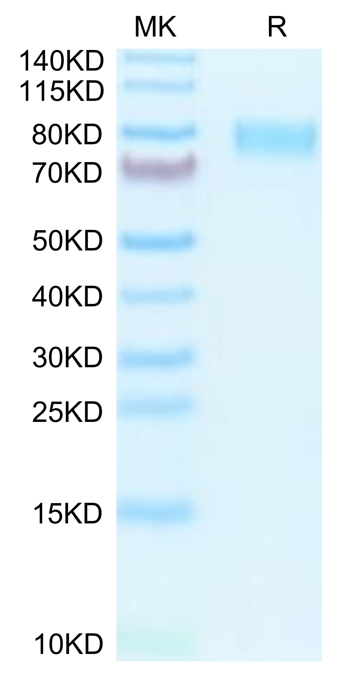 The protein has a predicted MW of 56.3 kDa. Due to glycosylation, the protein migrates to 76-82 kDa based on Tris-Bis PAGE result.