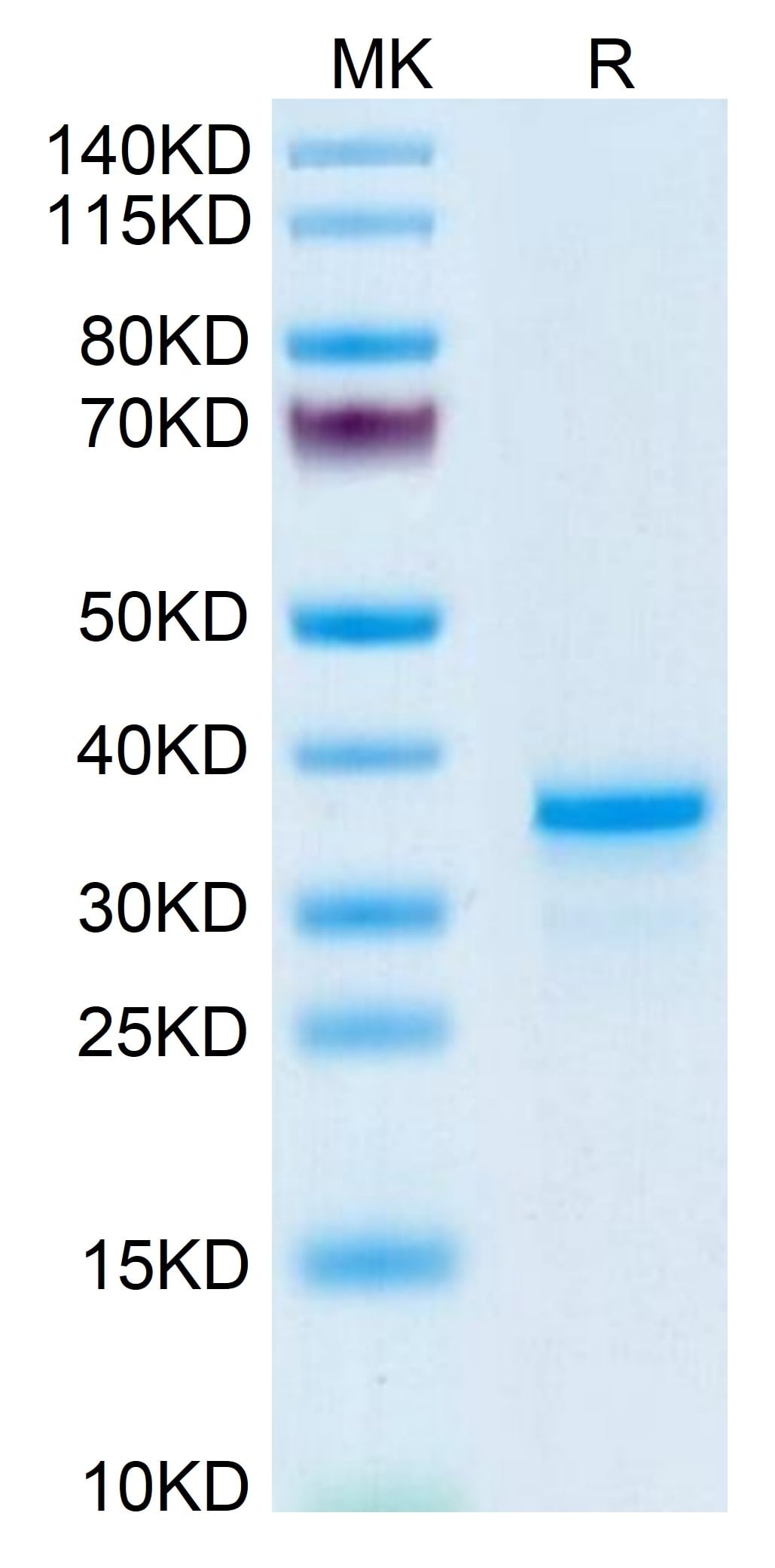 The protein has a predicted MW of 28.3 kDa. The protein migrates to 33-36 kDa based on Tris-Bis PAGE result.
