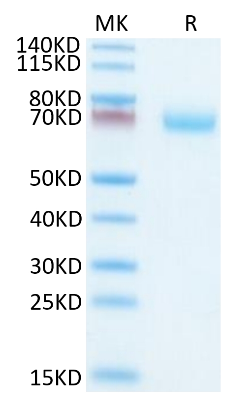 The protein has a predicted MW of 49.7 kDa. Due to glycosylation, the protein migrates to 60-70 kDa based on Tris-Bis PAGE result.