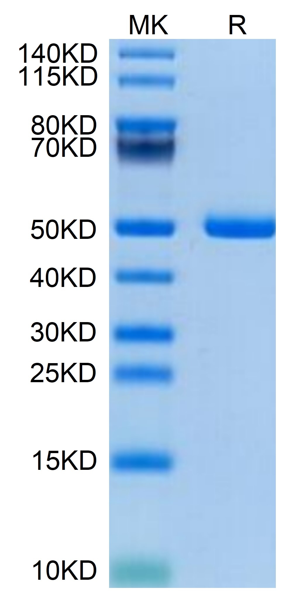The protein has a predicted MW of 37.9 kDa. Due to glycosylation, the protein migrates to 48-51 kDa based on Tris-Bis PAGE result.
