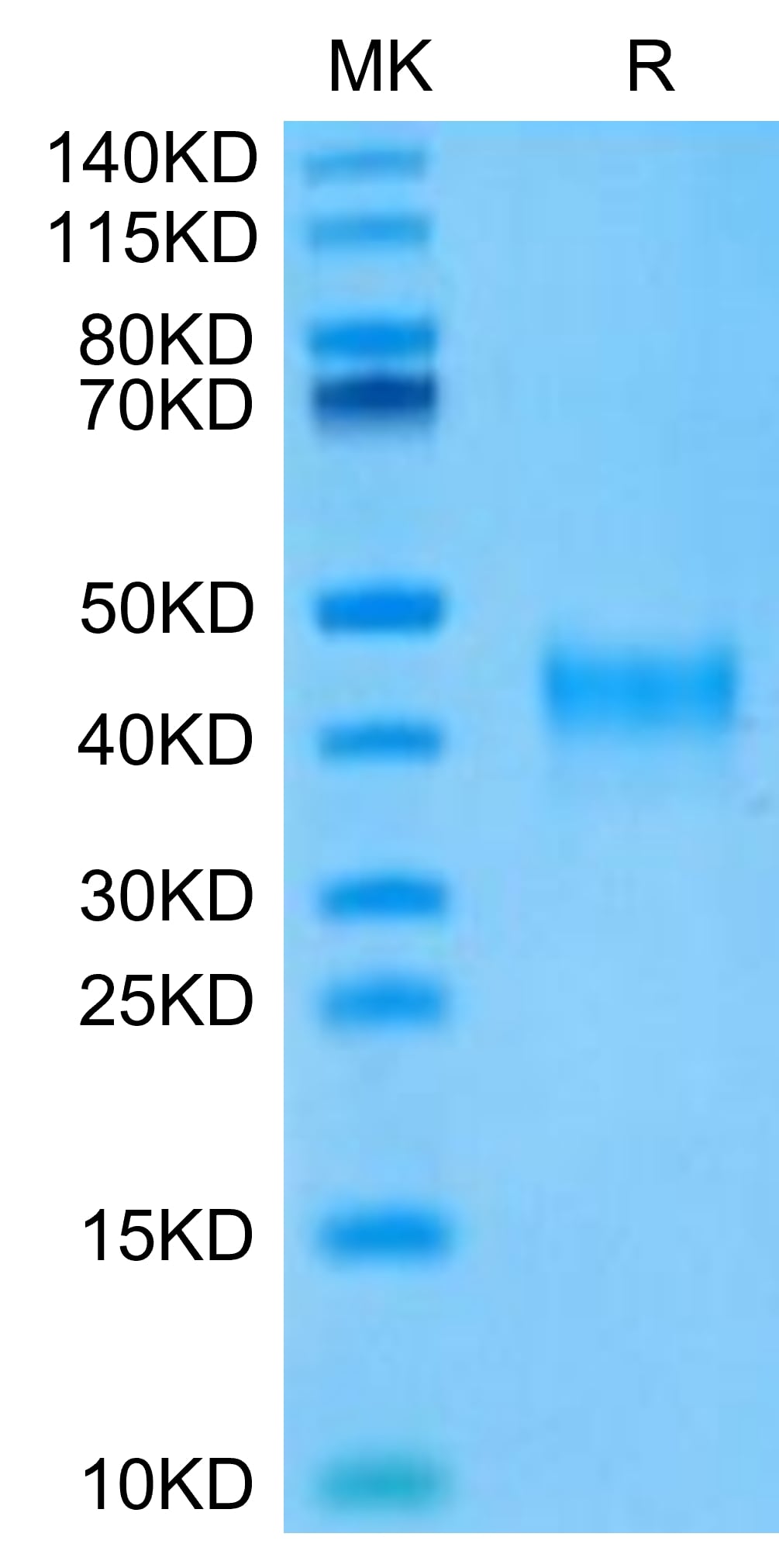 The protein has a predicted MW of 25.72 kDa. Due to glycosylation, the protein migrates to 40-50 kDa based on Tris-Bis PAGE result.