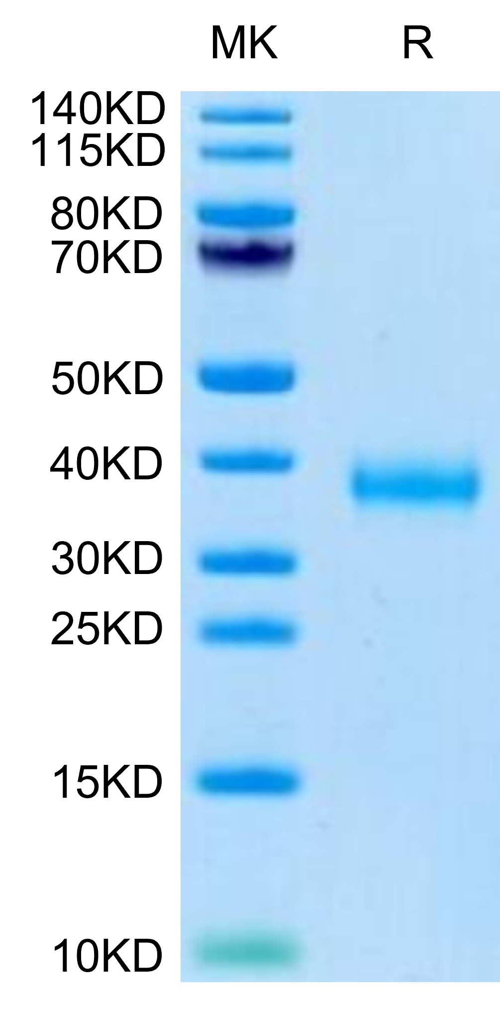 The protein has a predicted MW of 26.26 kDa. Due to glycosylation, the protein migrates to 35-40 kDa based on Tris-Bis PAGE result.