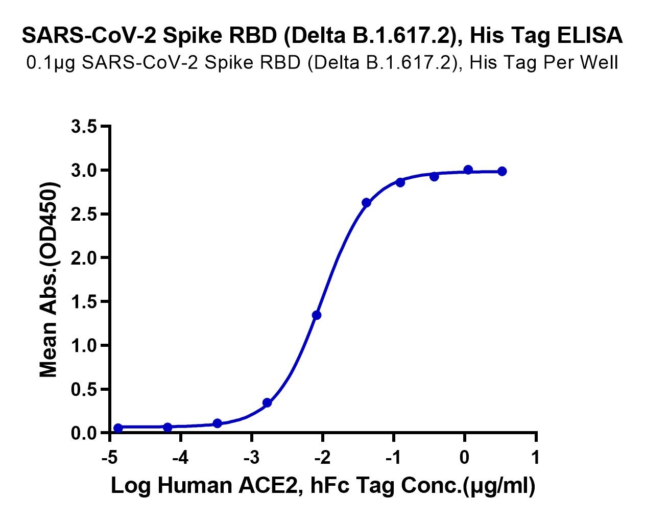 Immobilized SARS-CoV-2 Spike RBD (Delta B.1.617.2) , His Tag at 1ug/ml (100ul/well) on the plate. Dose response curve for Human ACE2, hFc Tag with the EC50 of 9.8ng/ml determined by ELISA. See testing image for detail.