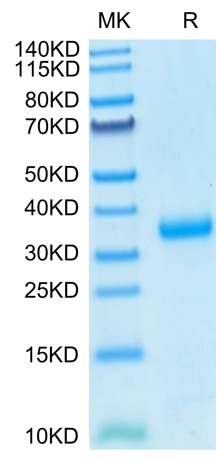 The protein has a predicted MW of 26.2 kDa. Due to glycosylation, the protein migrates to 36-40 kDa based on Tris-Bis PAGE result.
