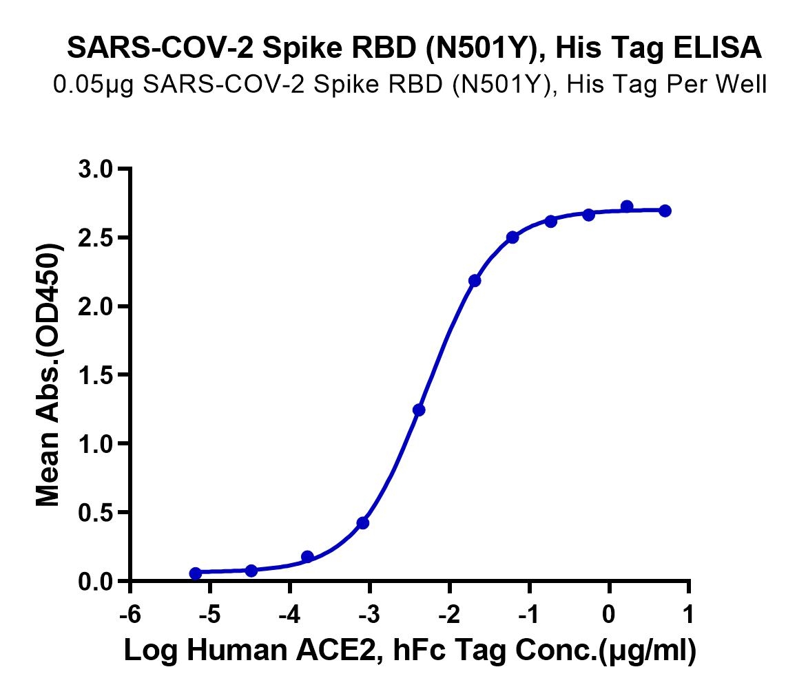 Immobilized SARS-COV-2 Spike RBD (N501Y) , His Tag at 0.5ug/ml (100ul/Well) on the plate. Dose response curve for Human ACE2, hFc Tag with the EC50 of 5.1ng/ml determined by ELISA (QC Test). The affinity constant of 1.74nM as determined in SPR assay (Biacore T200). See testing image for detail.