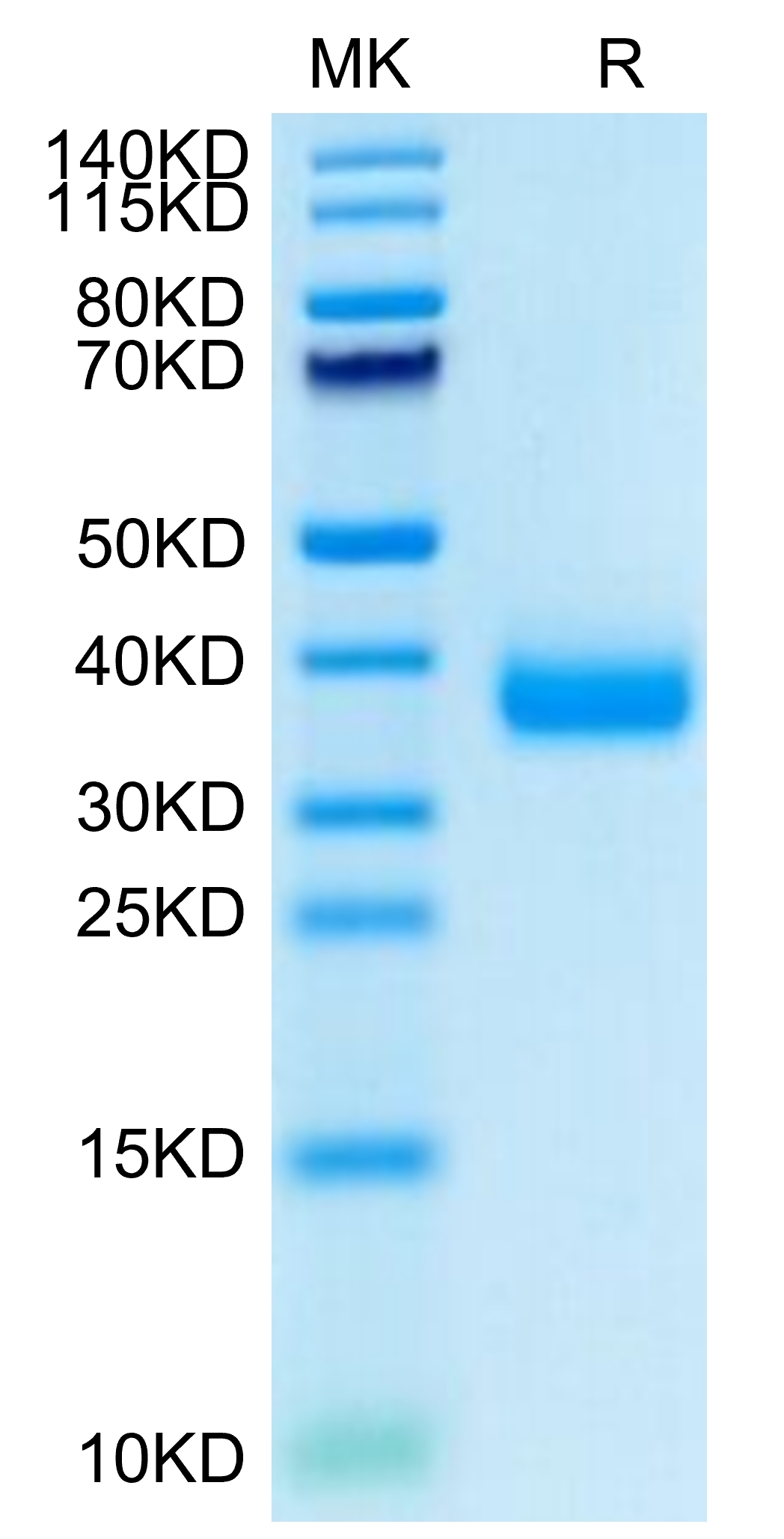 The protein has a predicted MW of 26.2 kDa. Due to glycosylation, the protein migrates to 35-40 kDa based on Tris-Bis PAGE result.