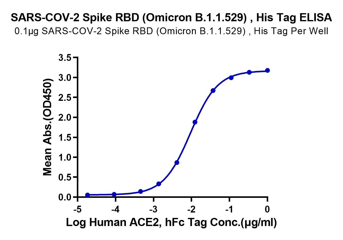 Immobilized SARS-COV-2 Spike RBD (Omicron B.1.1.529) , His Tag at 1ug/ml (100ul/well) on the plate. Dose response curve for Human ACE2, hFc Tag with the EC50 of 9.4ng/ml determined by ELISA. See testing image for detail.