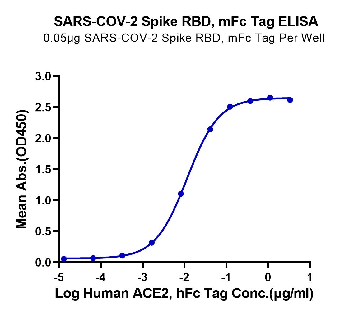Immobilized SARS-COV-2 Spike RBD at 0.5ug/ml (100ul/Well). Dose response curve for Human ACE2, hFc Tag with the EC50 of 11.6ng/ml determined by ELISA. See testing image for detail.